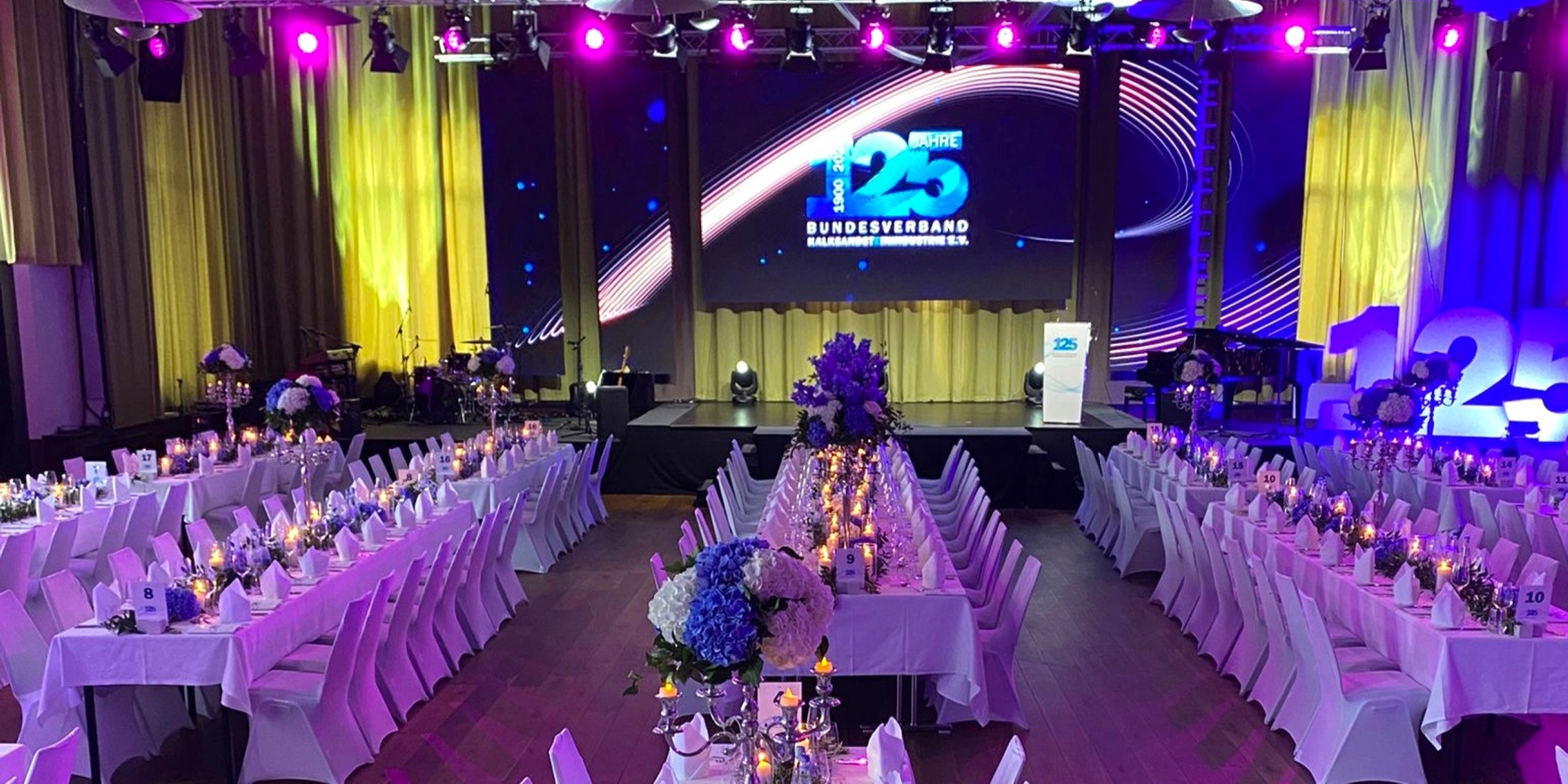 Für das Firmenjubiläum eines namhaften Unternehmens verwandelten wir eine hauseigene Industriewerkshalle in ein atmosphärisches Event-Highlight. Die Dekoration inszenierte kühle Blautöne in verschiedenen Farbtiefen – präzise abgestimmt auf das Lichtkonzept, die Architektur und das Gestaltungsmotto. Die gesamte Planung, Logistik und Umsetzung erfolgte in enger Zusammenarbeit mit einer führenden Eventagentur. Ein Beispiel für gelungene High-End Business-Floristik im industriellen Umfeld.