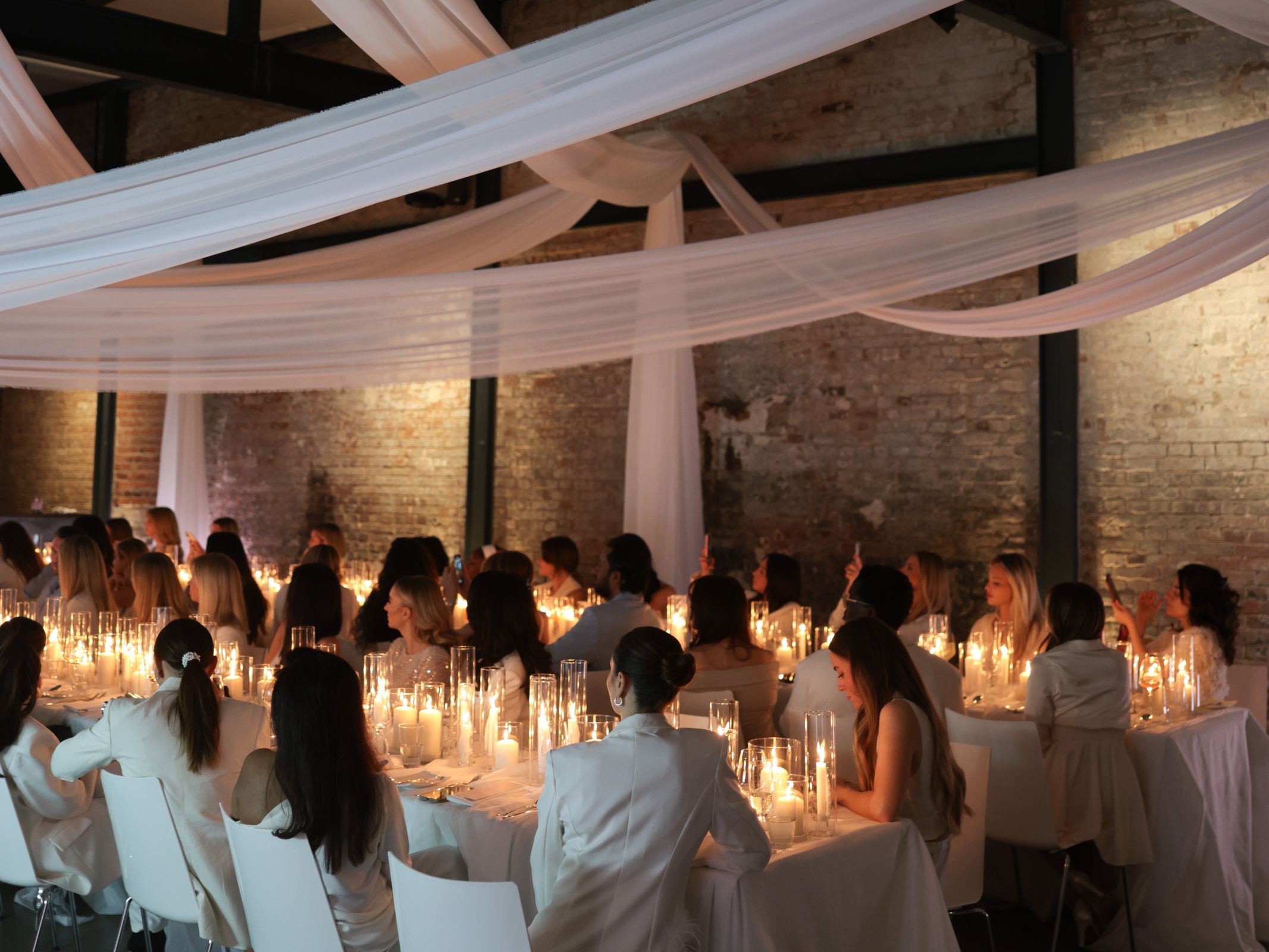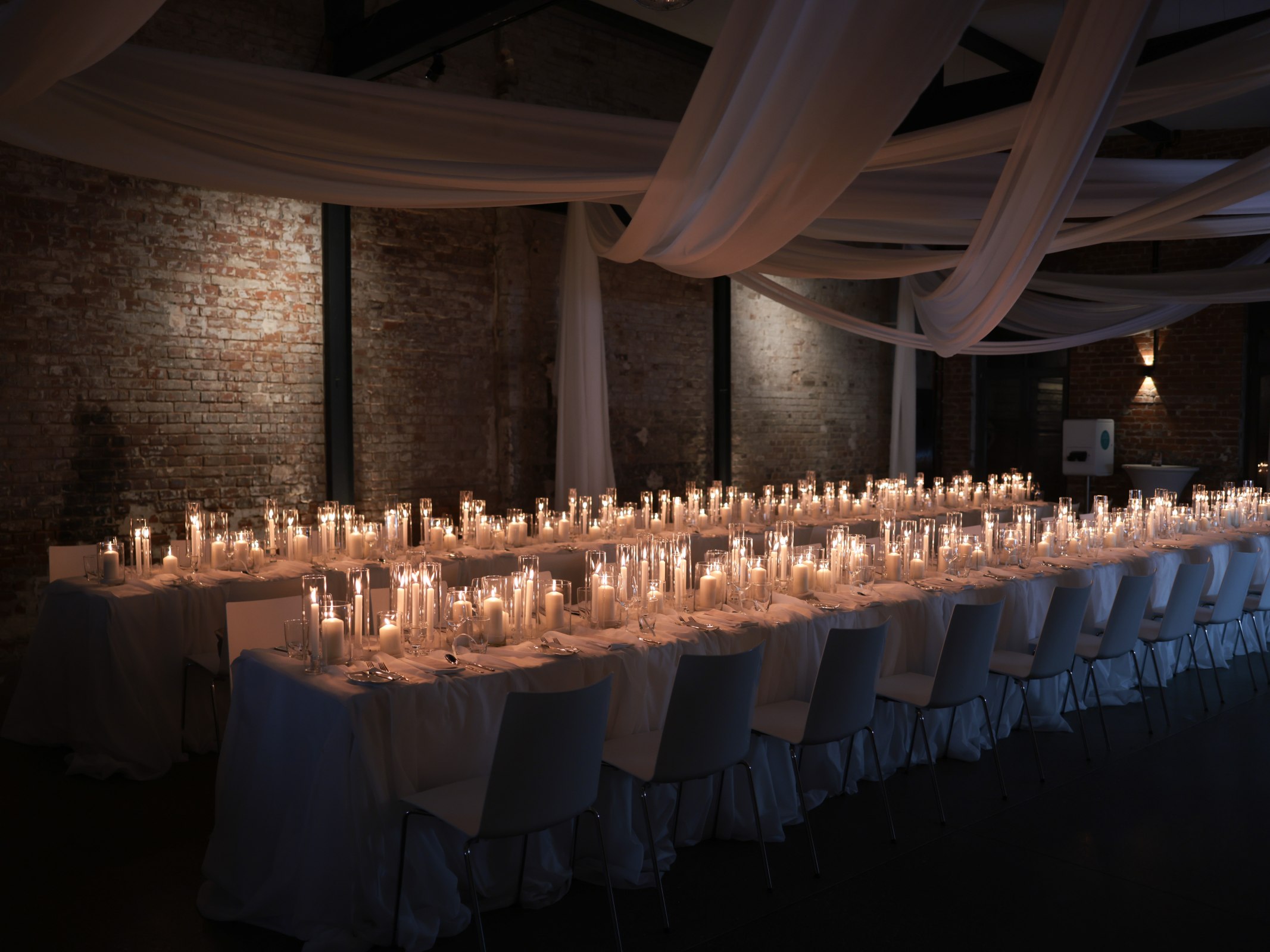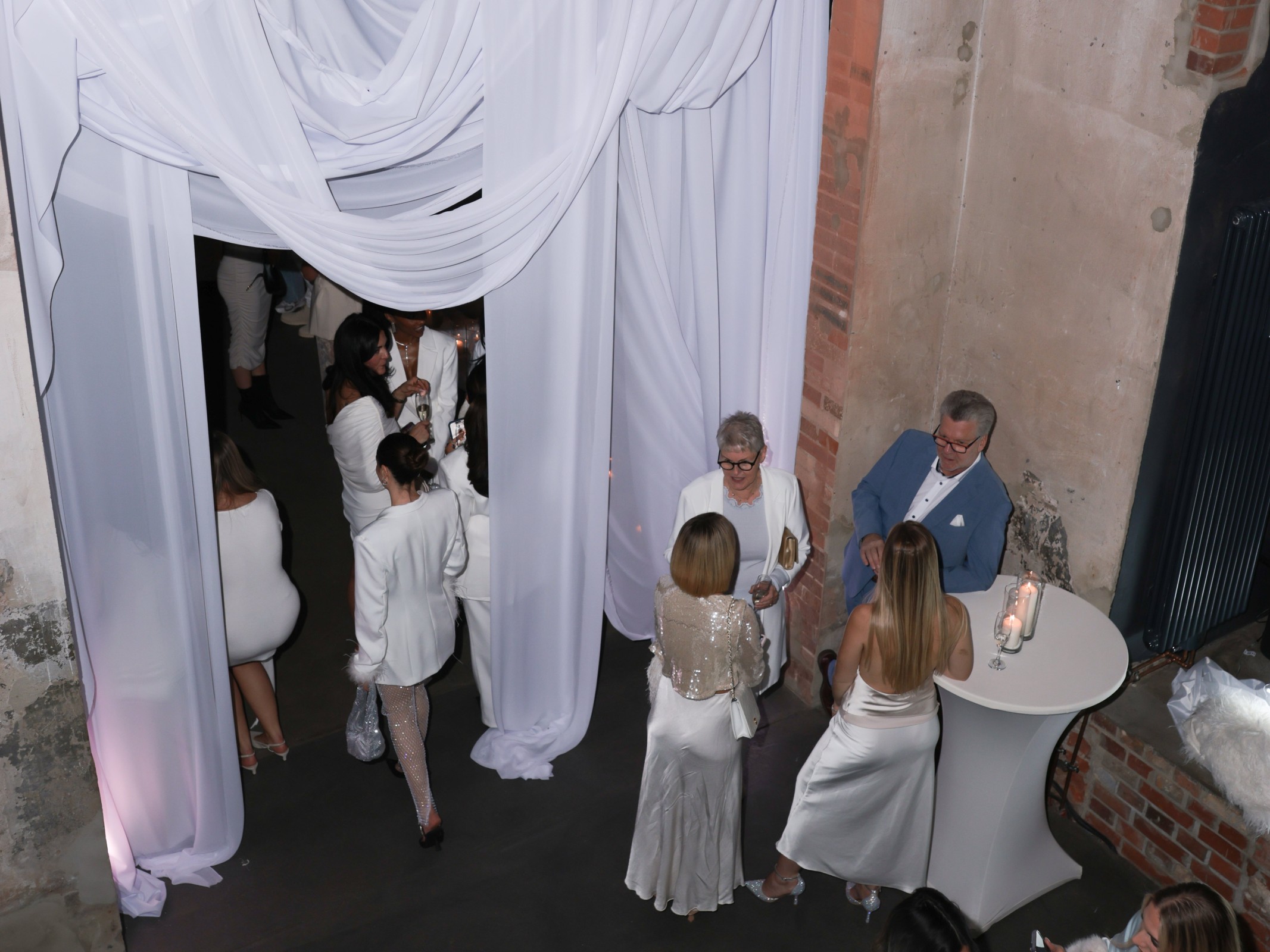 Wir durften den Produktlaunch einer renommierten Kosmetikfirma floristisch und dekorativ gestalten. In enger Zusammenarbeit mit der Eventagentur und der Location entwickelten wir ein fließendes Raumkonzept in reinen Weißnuancen – angelehnt an die Leichtigkeit der neuen Creme. Mit schwebenden B1-Stoffen, unserem modularen Mietvorhangsystem, ausgewählten Kerzengläsern und temporär gesetzten Schleierkraut-Highlights entstand eine puristische, aber wirkungsstarke Inszenierung. Der nächtliche Aufbau wurde logistisch präzise mit allen Gewerken abgestimmt.